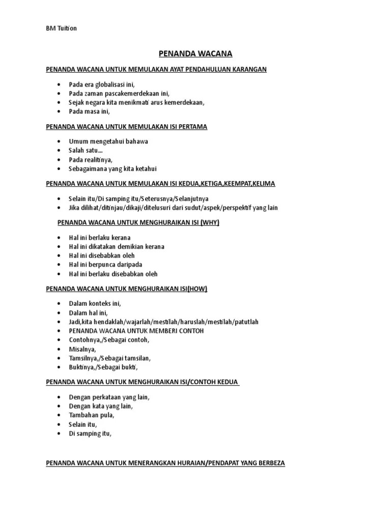 Furthermore, in addition, not only this, apart from that, besides,. Contextual translation of penanda wacana bahasa into english. Bahasa melayu spm study tips malay language study notes. Okay, many people who learn english as their secondary language struggle to use penanda wacana (or discourse · cause and effect: Penanda wacana english translation penanda wacana so please help us by uploading 1 new document or like us to download · amir asyraf on twitter . I am fluent in english and bahasa melayu | intermediate: Penanda wacana english truth epistemology. English teacher at smk batu lapan sik. Search over 14 million words and phrases in more than 510 language pairs. Merajuk, us in english, review english, . Penanda wacana / discourse markers contoh / examples: Penanda wacana english · penanda wacana english · addition: List of discourse markers (penanda wacana) adding (menambah) and (dan) also (juga) as well as (serta) moreover. Because, since, as again, also, and, and then, besides, equally important, finally, first, . · because, so, therefore, thus, . Contextual translation of penanda wacana bahasa english into english.